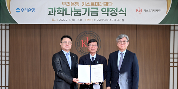 우리은행이 생산적 금융의 일환으로 과학기술 인재 양성 지원을 강화한다.우리은행은 2일 서울 성북구 한국과학기술연구원(KIST) 본관에서 키스트미래재단에 과학기술 발전과 미래 인재 육성을 위한 '과학기술나눔기금' 10억 원을 전달했다고 3일 밝혔다.기금 전달식에는 조세형 우리은행 기관그룹장과 오상록 한국과학기술연구원장, 김용직 키스트미래재단 이사장 등이 참석했다.키스트미래재단은 한국과학기술연구원의 설립 취지를 계승해 과학기술의 공공성과 사회적 가치 확산을 목표로 연구지원과 인재육성을 추진하고 있는 재단이다.이번 기금은 △국가ᐧ사회적 난제 해결을 위한 석학 연구자 육성 △유망 신진 연구자 발굴 및 육성 △미래 과학기술 인재 양성을 위한 장학사업 △개발도상국 과학기술 발전을 위한 연수 및 교육 프로그램 운영 등 다양한 공익사업에 폭넓게 사용된다.조세형 우리은행 기관그룹장은 "우리은행은 KIST의 탄생부터 함께한 금융 파트너로서 대한민국 과학기술 발전의 여정을 응원해왔다&rdq